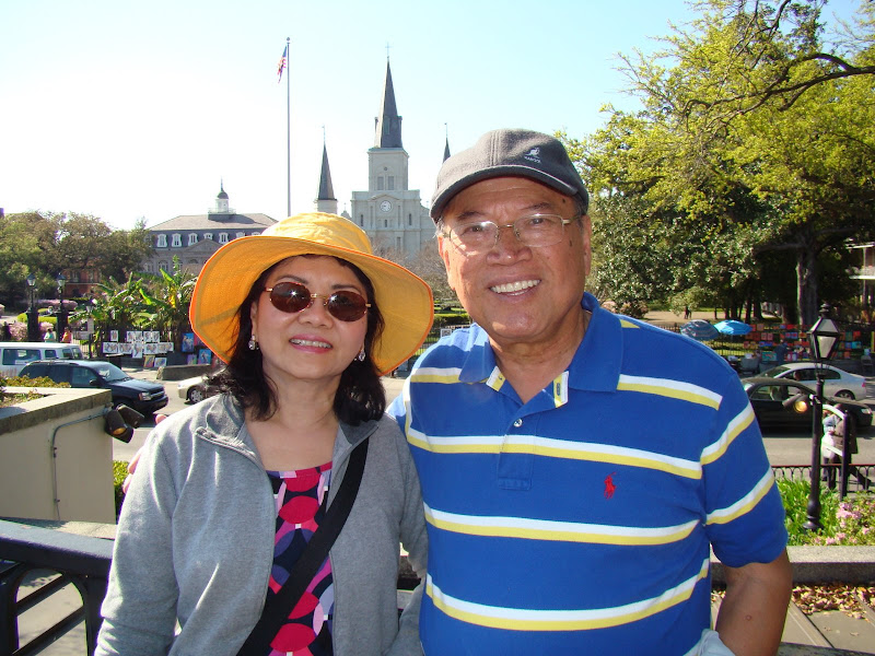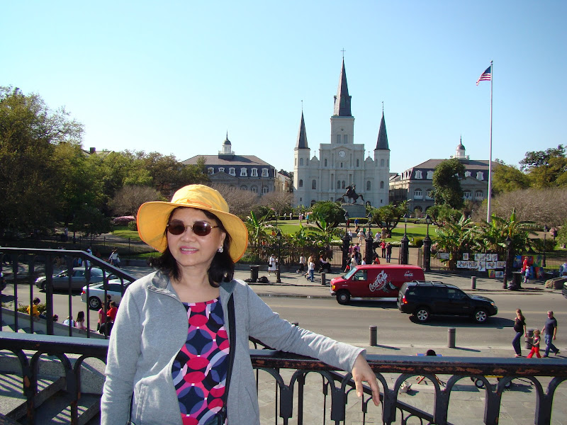 Tại công viên Jackson, sau lưng chúng tôi là nhà thờ St Louis nổi tiếng thế giới, vì Đức Giáo Hoàng John Paul II trong lần thăm viếng Mỹ lần thứ hai đã đến đây cầu nguyện cùng các giáo sĩ Mỹ..
